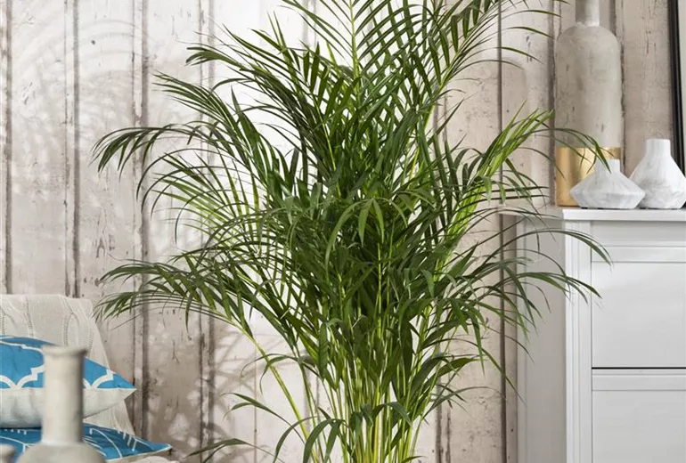Wenn der Frühling noch nicht in Sicht ist und auch keine Fernreise auf dem Programm steht, wird unsere Sehnsucht nach exotischen Gefilden besonders groß. Dann hilft nur eins: Holen Sie sich die Tropen in Ihre vier Wände! Palmen bilden eine besonders attraktive „Untergruppe“ der Zimmerbäume. Viele Arten erreichen beeindruckende Wuchshöhen von zwei Metern oder mehr. So zählt die Bergpalme ( Chamaedorea elegans ) zu den besonders schnell wachsenden Vertretern ihrer Familie. Diese Zierpalme besitzt grazile, gefiederte Wedel und ist ausgesprochen pflegeleicht. Sie bevorzugt halbschattige bis schattige Standorte – keine direkte Sonneneinstrahlung! Gelegentliches Besprühen beugt braunen Blattspitzen vor. Die Kentiapalme ( Howea forsteriana ) besticht durch elegante, filigrane Wedel in dunklem Grün; sie kommt mit relativ wenig Licht und trockener Luft gut zurecht, was sie zur Ausnahmeerscheinung unter dem Palmen macht und auch für dunklere Raumecken prädestiniert. Zugluft und direkte Sonne meiden! Die Fischschwanzpalme ( Caryota mitis ) besitzt wie abgerissen aussehende Blätter, die ihr eine aparte Anmutung geben. Sie braucht einen hellen Standort und muss immer leicht feucht gehalten werden – Staunässe jedoch unbedingt vermeiden.