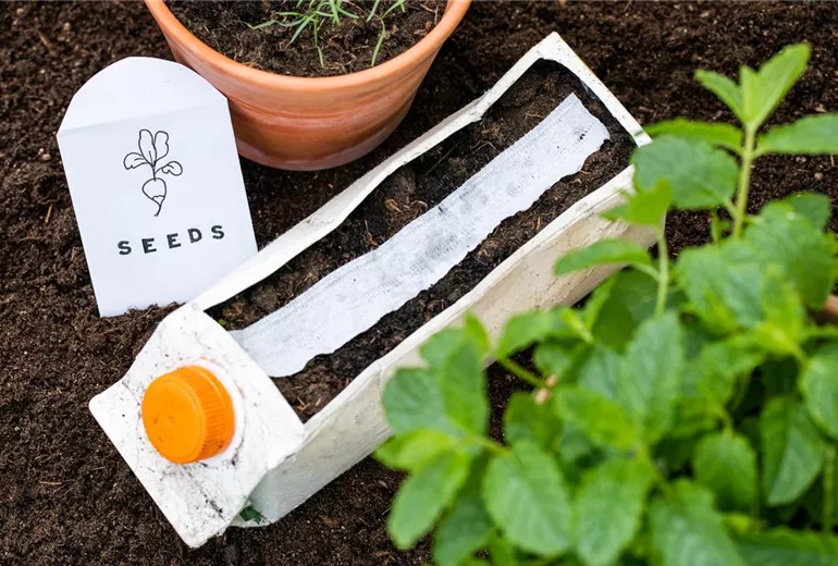 Damit in der Milchtüte ab sofort kleine Pflanzen Platz finden, müssen die Milchtüten ein bisschen umgebaut werden. Je nachdem, wie groß die neuen Pflanzentüten werden sollen, wird der obere Teil mit einem Cuttermesser vom Rest der Milchtüte abgetrennt. Dann sollten die Milchtüten gründlich ausgespült und mit Spüli gewaschen werden, damit später nichts stinkt oder schimmelt. Anschließend werden die Milchtüten so lange zusammengedrückt, bis sie sich leicht formen lassen. Wer die Milchtüten bemalen möchte, kann dann an der Naht vorsichtig die erste Schicht Papier von den Milchtüten lösen. Dann werden die Ränder umgeklappt, damit es gekrempelt aussieht.